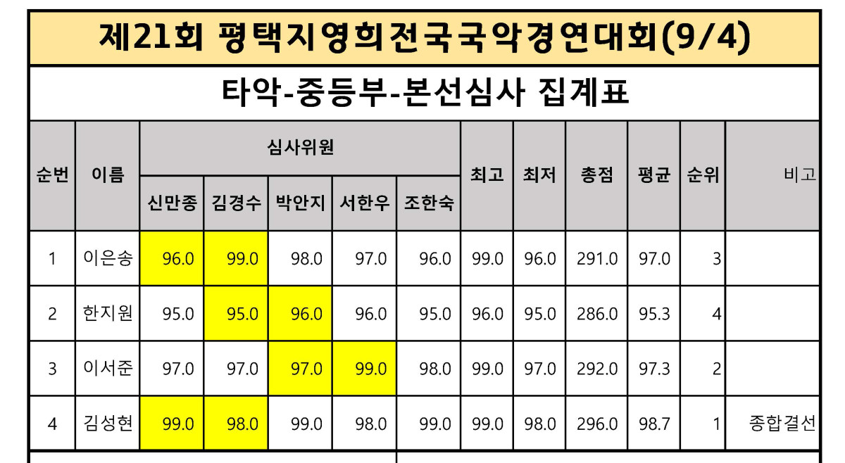 제21회 평택지영희전국국악경연대회-타악본선 결과